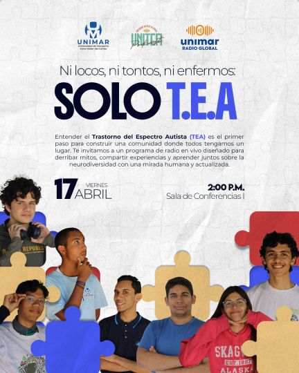 El Departamento de Bienestar Estudiantil, en alianza con Unimar Radio Global y el grupo estudiantil UNITEA, tienen el placer de invitar a la comunidad unimarista a participar en el programa de radio (en vivo) y jornada de sensibilización titulada: «Ni locos, ni tontos, ni enfermos: Solo TEA».