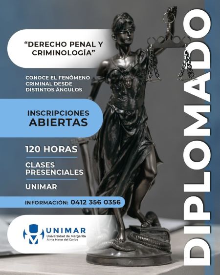 En alianza con el Escritorio Jurídico Martínez & Asociados, la Universidad de Margarita ofrece Diplomado en Derecho Penal y Criminología a toda la comunidad neoespartana, especialmente a los abogados, estudiantes de Derecho (a partir del segundo trimestre) y funcionarios que laboren en el área de las Ciencias Penales y Criminológicas.