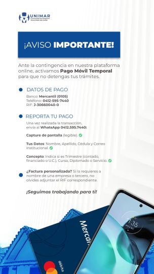 Debido a la incidencia técnica externa que afecta nuestra plataforma de pagos online, y con el objeto de garantizar que puedas completar tus trámites sin demoras, hemos activado de manera temporal y excepcional el uso de Pago Móvil como alternativa de pago.